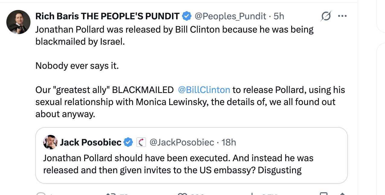 Pollard wasn't released by Bill Clinton. Israel asked the U.S. to release him in 1998 but Clinton denied the request(which is at odds with the blackmail story). He was released on November 20, 2020 and on December 30, 2020 was relocated to Israel. Both events occurred during the Trump presidency—the first term. It is one of the many things Tucker gets wrong because he is embracing whatever narrative suits him to paint Israel as a constant villain.