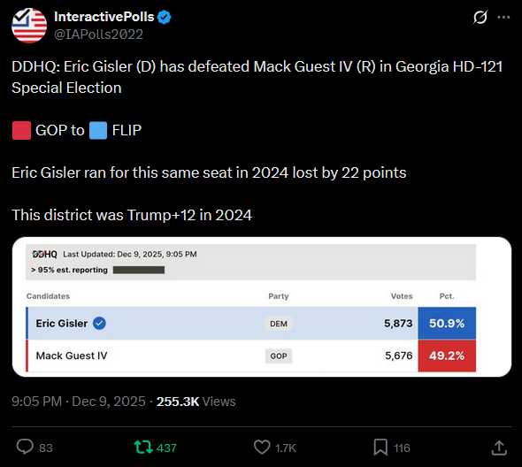 Everyone has been so focused on the House that I've not seen anyone discuss the risk to state legislatures for the midterms. This GA state house district was Trump +12 in 2024, and this same Democrat lost by 22 points last time it was up. Republicans also lost a PA state senate special that was Trump +15 earlier this year.