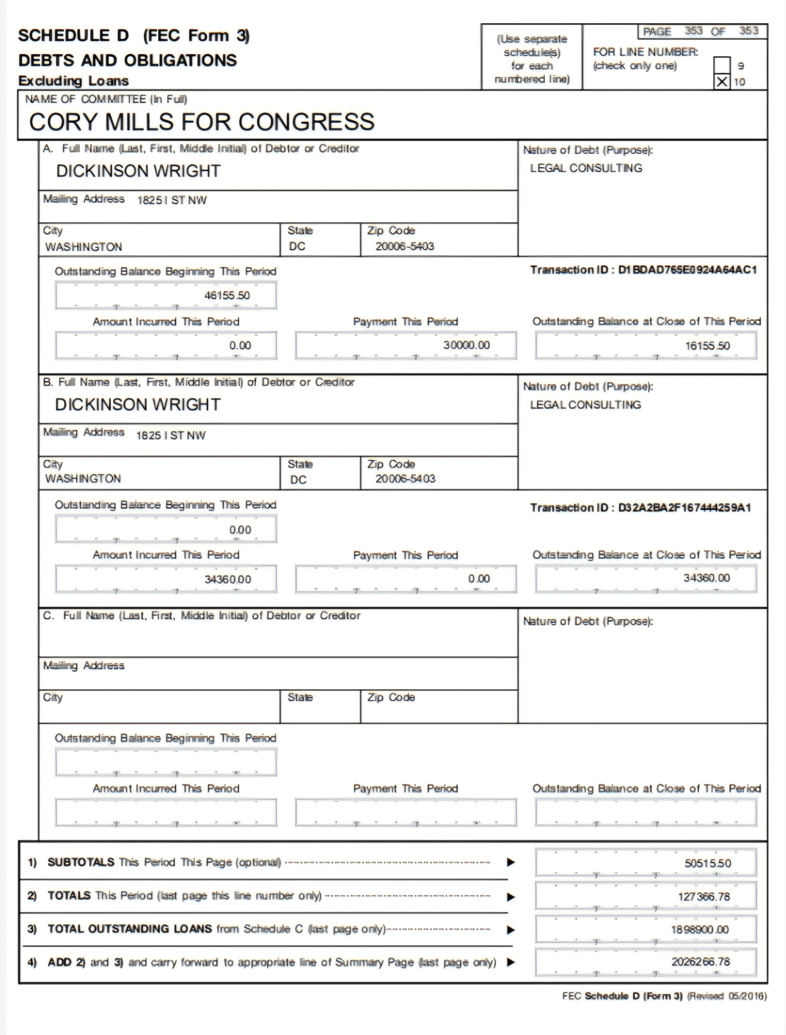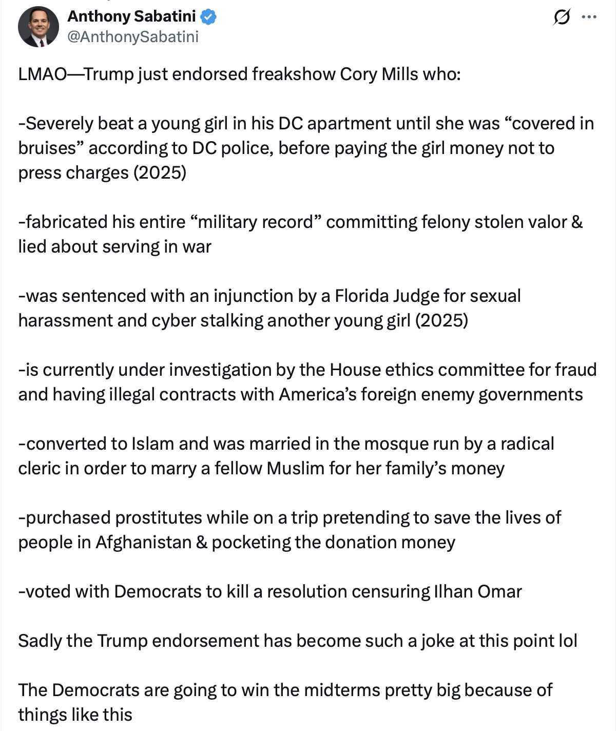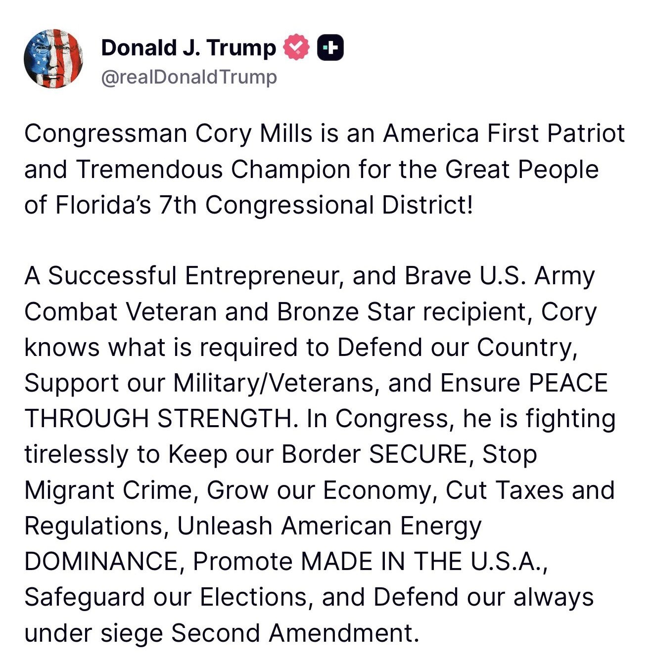 Another F'ing horrendous endorsement by Trump Cory Mills FL 7th. FCC records shows he owes Kimberly Guilfoyl consulting group i.e. Don Jr. for this endorsement.