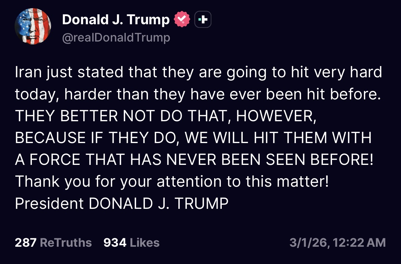 Trump issued this warning to Iran, which of course will not dissuade them from doing whatever they intend to do. I hope this is not the president trying to bluff them because we are in worse shape than we know.