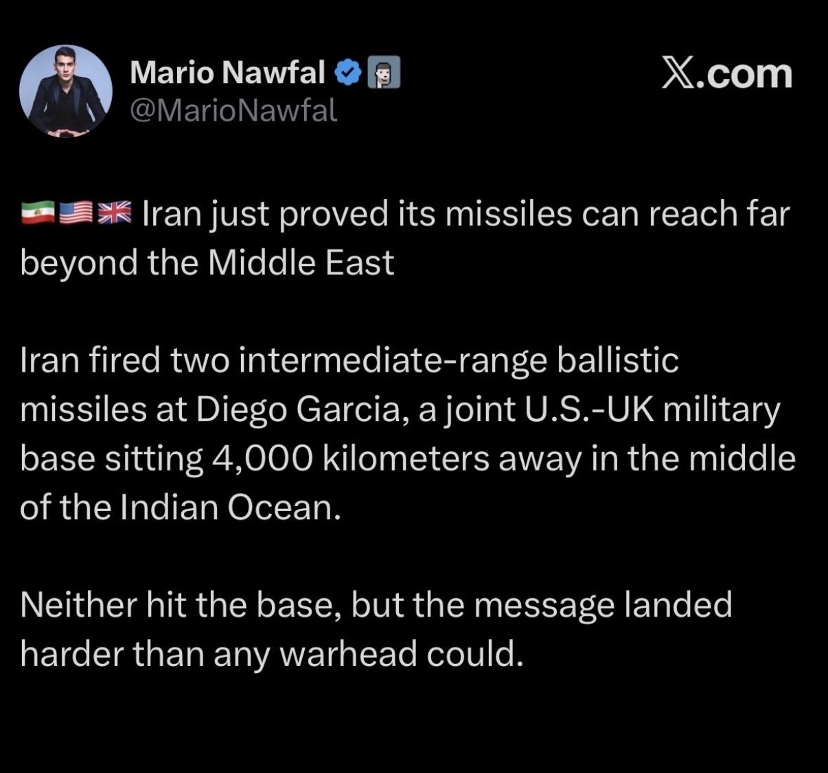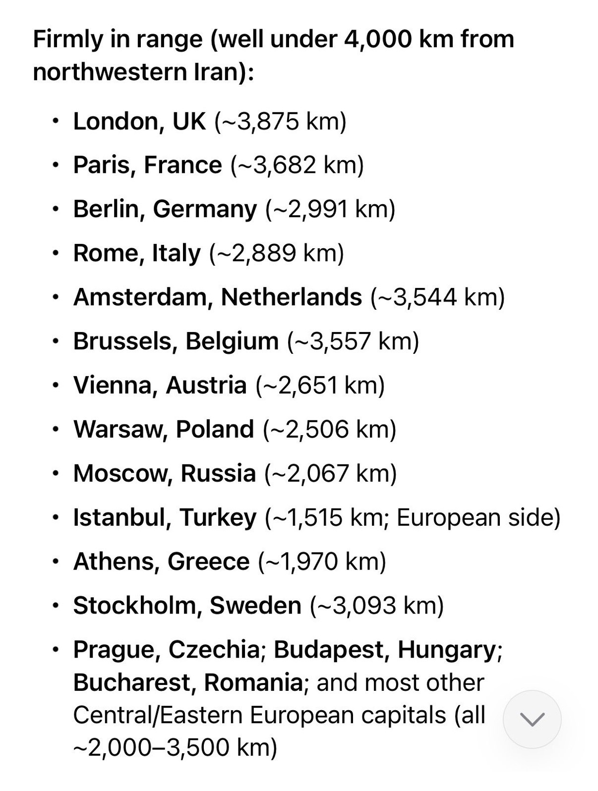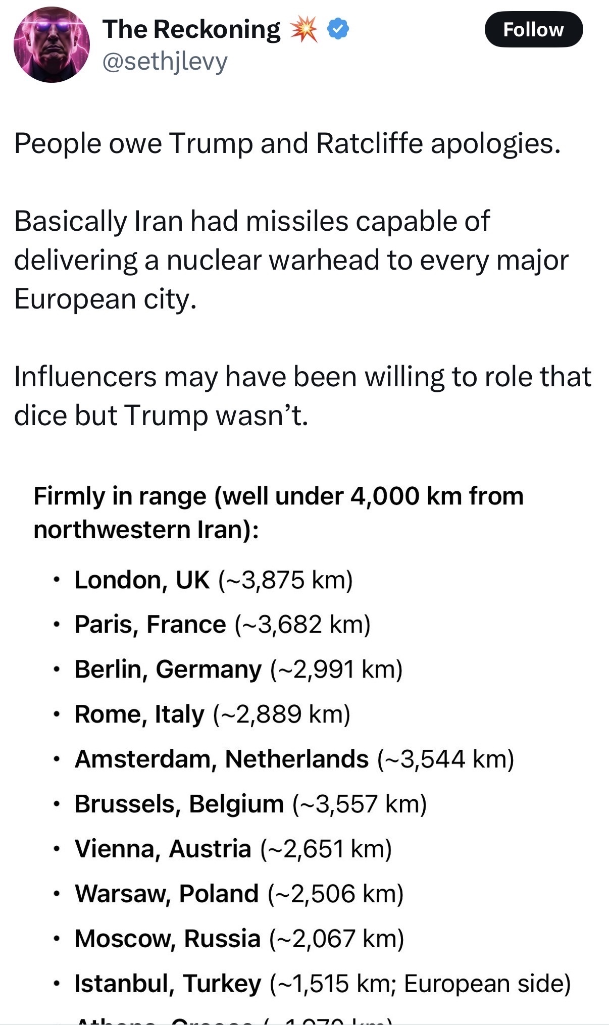 I have friends re-posting this on X, as “proof” that Iran was an “imminent” threat to the West because they do have missiles that can reach 4,000 km away, hitting targets in Europe.