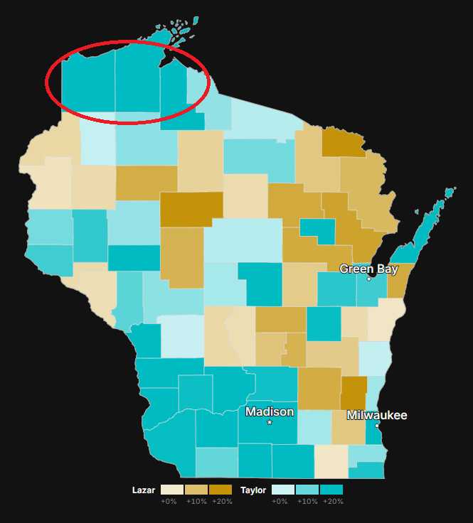 -The democrat won the Wisconsin SC race by over 20 points, an improvement over the 10-11 point victories seen in the recent 2023 and 2025 court races. Republicans saw erosion everywhere, but particularly devastating were the three northwest "Lumberjack Counties" of Douglas, Bayfield, and Ashland (left to right). These are Democrat counties, but they are very anti war and the type of voters that OG Trumpism could win that the GOPe couldn't. In 2024, Trump got in the mid to high 40's in these counties. Even in the last WI Supreme Court race, the Republican got in the low 40's in these counties, he did not lose in these counties as bad versus other parts of the state. Last night, the Republican got ...
